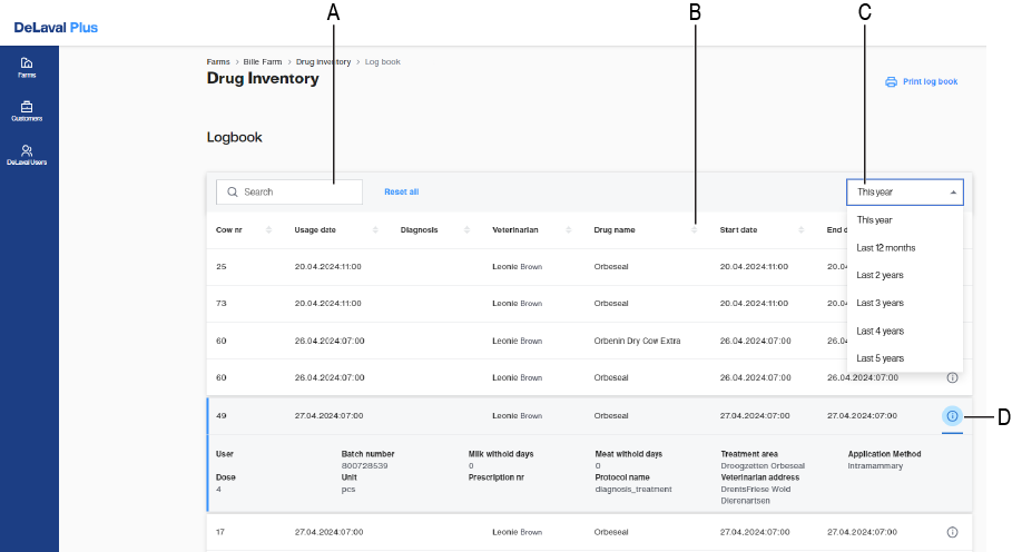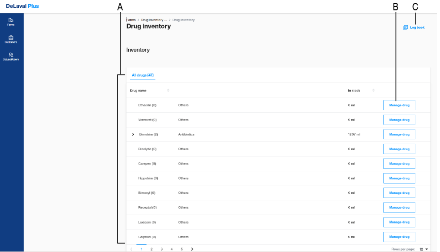Gehen Sie zum Arzneimittelbestand und klicken Sie auf die Schaltfläche Logbuch (C).