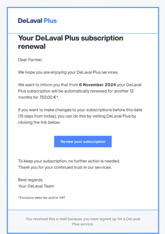 45 Tage vor Ablauf der Abonnementlaufzeit erhalten Sie eine E-Mail mit Informationen zu Ihrem Abonnement und einem Link zu DeLaval Plus. Klicken Sie auf den Link, wenn Sie Änderungen an Ihrem Abonnement vornehmen möchten.