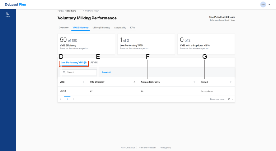 Bemerkung (G): Faktor, der zur Verbesserung der Leistung berücksichtigt werden sollte. Basierend auf der Punktzahl wird eine Bemerkung generiert, die den Hauptfaktor angibt, der die Leistung verbessern kann. Die Bemerkungen zur VMS-Effizienz können sein: