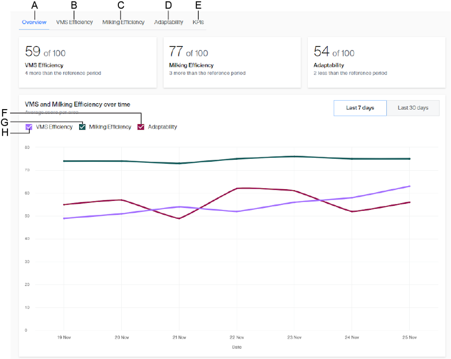 C | Milking efficiency tab | G | Milking efficiency graph |