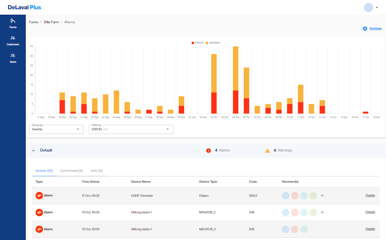 This guide explains to you how to get access to Alerts on DeLaval Plus; how you can act on alerts, and the different ways to filter the alerts history chart