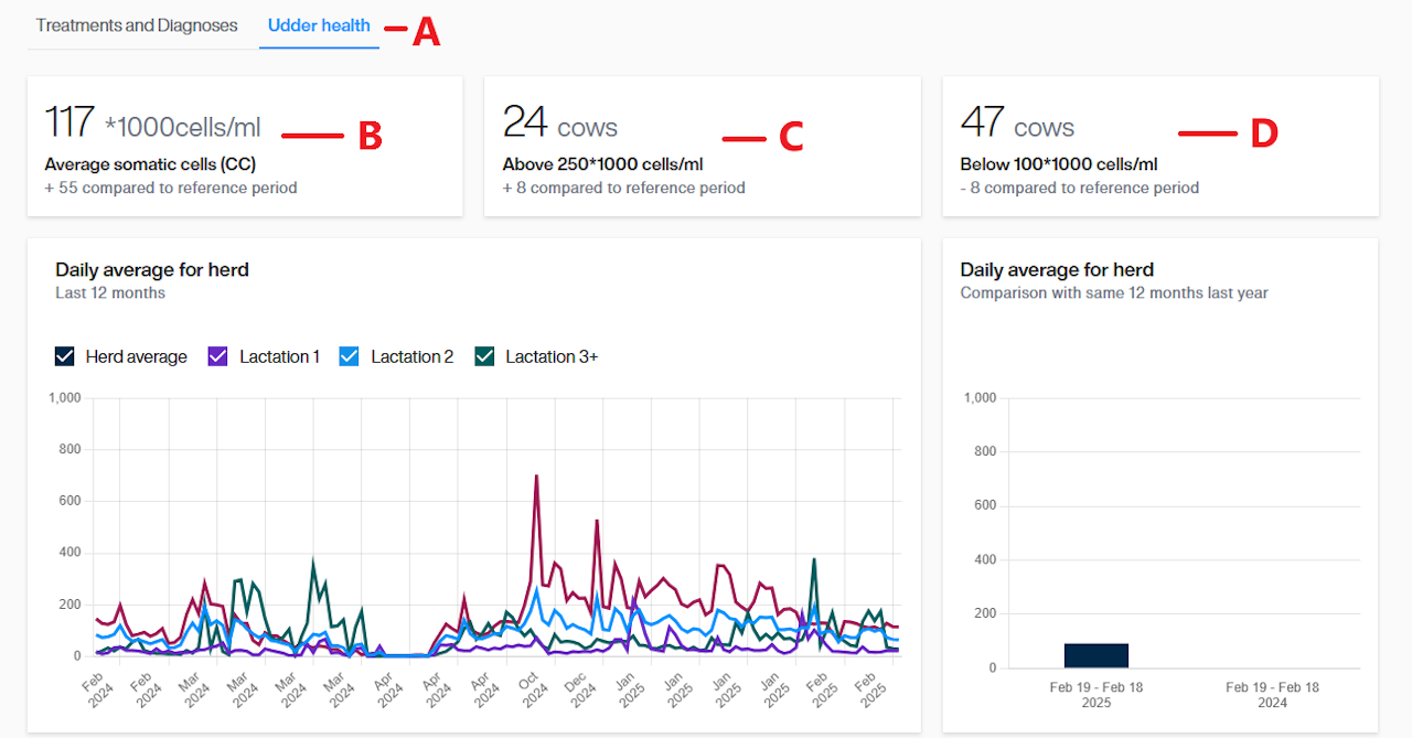 D | Näitab lehmarakkude arvu proovides, mille puhul oli väärtus alla 100 raku/ml, ja võrdlust võrdlusperioodiga. |