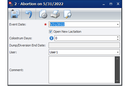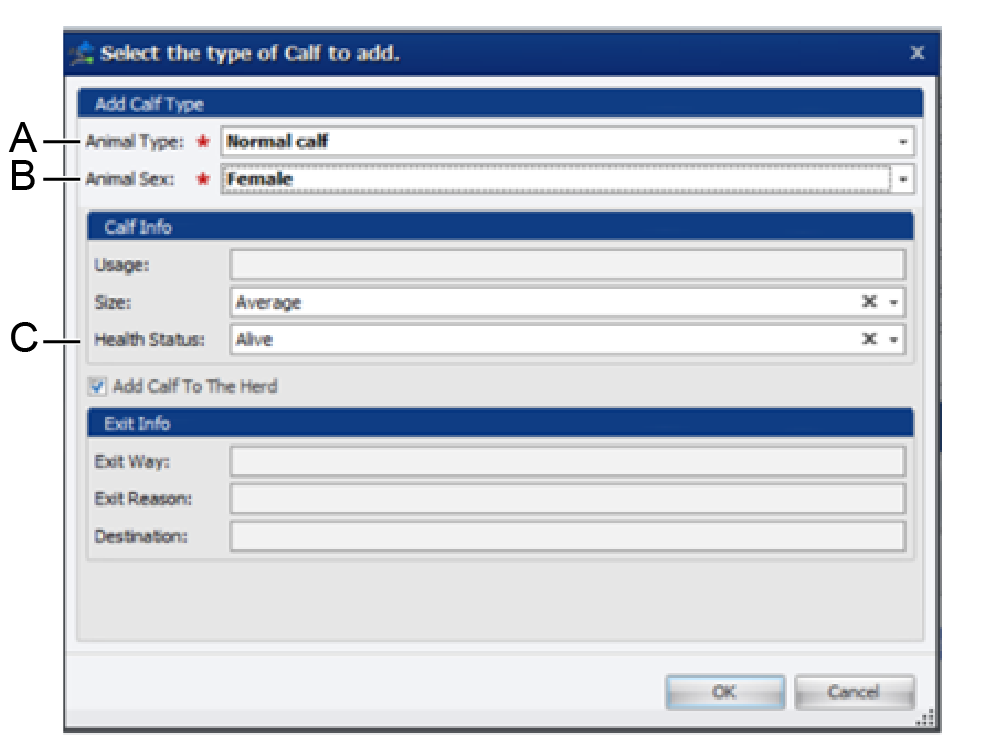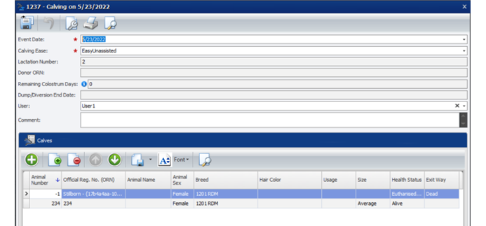 Kun Eläimen tyyppi on Kuolleena syntynyt vasikka, valitse jokin muu vaihtoehto, kuin Elävä