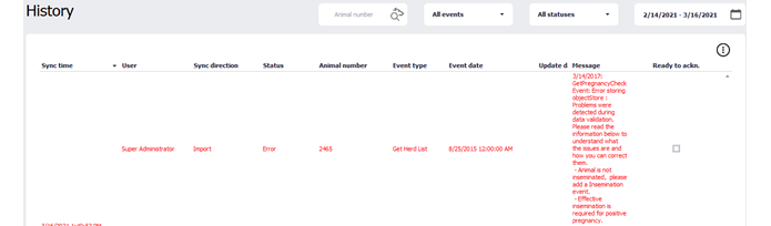 Vian kuvaus: Historia-välilehdellä näytetään varoituksia tietojen tuomisen jälkeen.