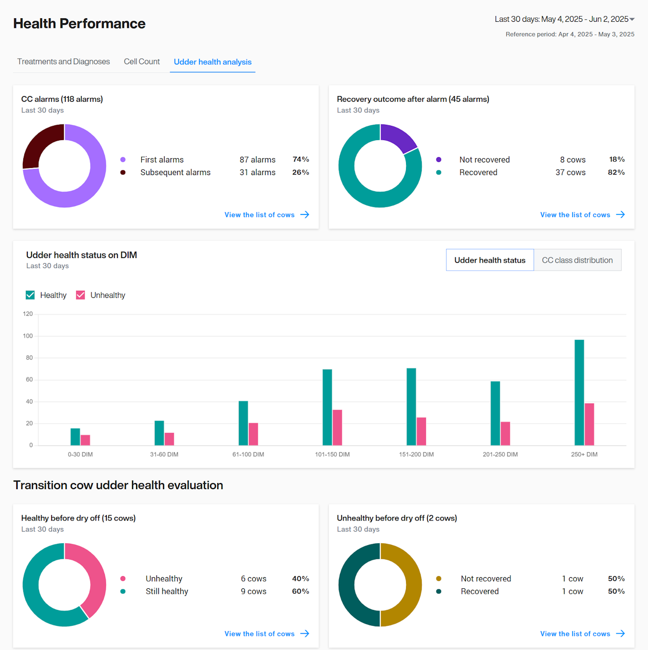 Sur cette page, vous trouverez la répartition des alarmes CC et leur rétablissement ultérieur, ainsi que des graphiques sur la classification des vaches. Pour les vaches en transition, vous pouvez consulter la répartition de leur classification avant et après le tarissement.