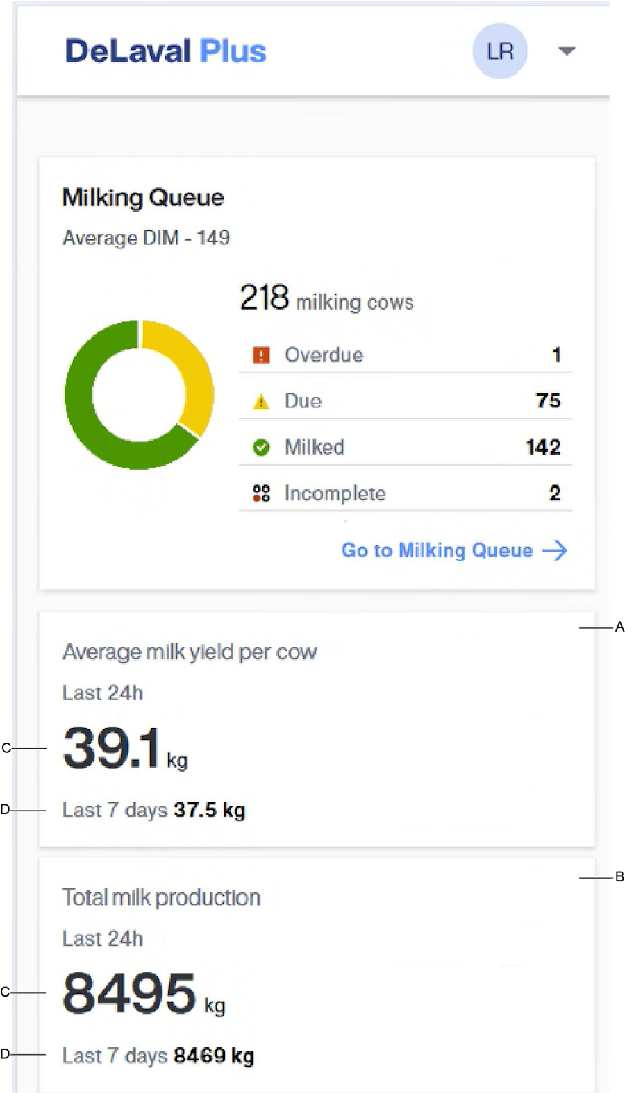 牛1頭あたりの平均乳量と総乳生産量は、最新24時間の平均(C)と最新7日間の平均(D)として表示されます。最新24時間の平均と最新7日間の平均を比較することができます。