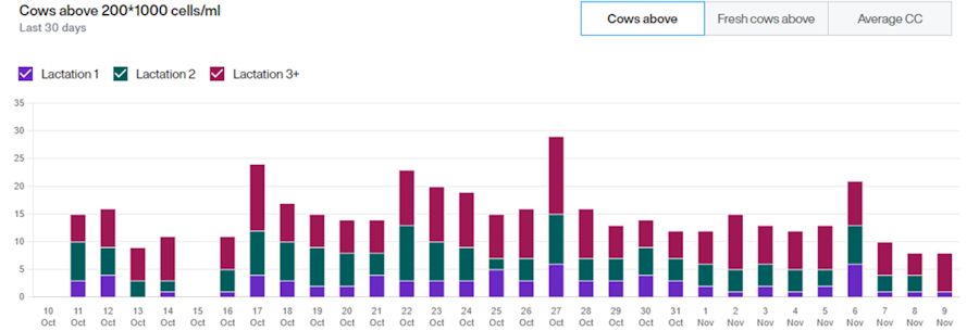 このチャートに掲載される牛は、最長40日間以内に、少なくとも2回連続して閾値を超える細胞数サンプルを取得している必要があります。2回目の測定は、選択した期間内に実施されている必要があります。この要件は、KPI「 200×1000細胞/mlを超える牛」の計算と一致しています。